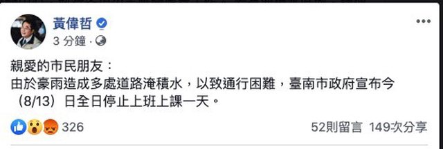 然後,2019年的8月13日,黃偉哲市長也放過豪雨假。