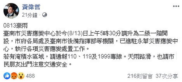 ▼黃偉哲6時29分宣布停班停課。(圖/翻攝黃偉哲臉書)