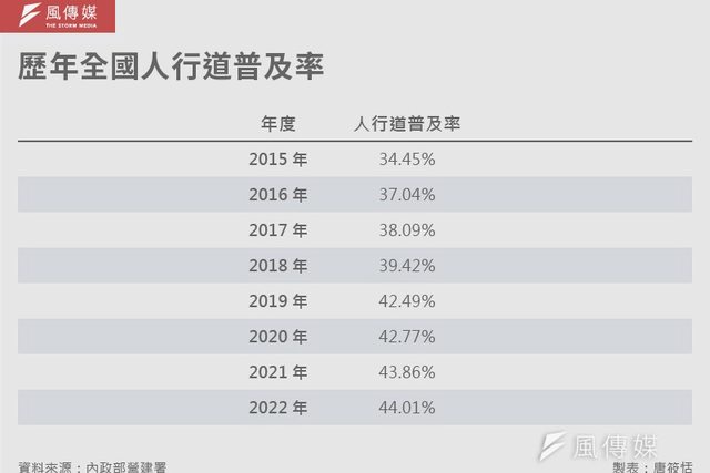 根據《風傳媒》2023年1月掌握的內政部營建署統計資料顯示,全台人行道普及率為