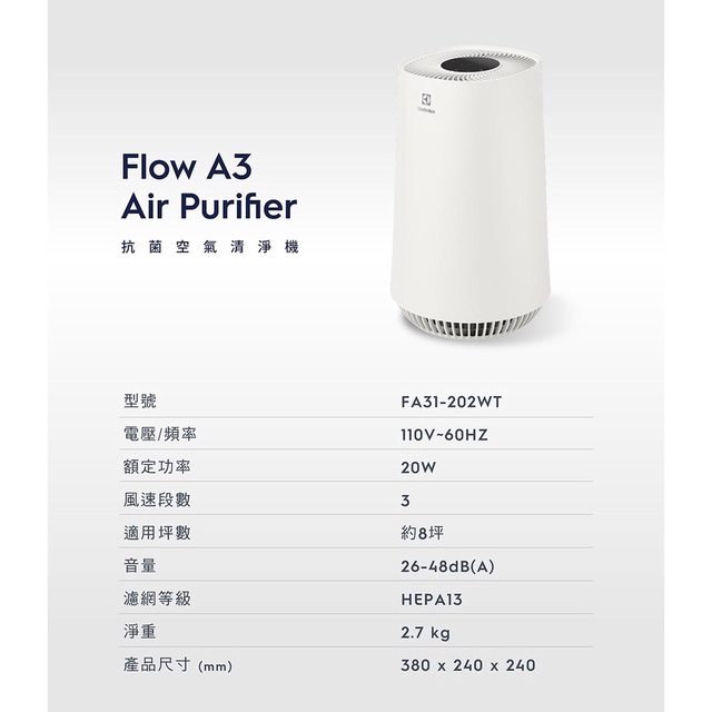 Electrolux 伊萊克斯 Flow A3 Air 抗菌空氣清淨機-8坪適用(冰河白)