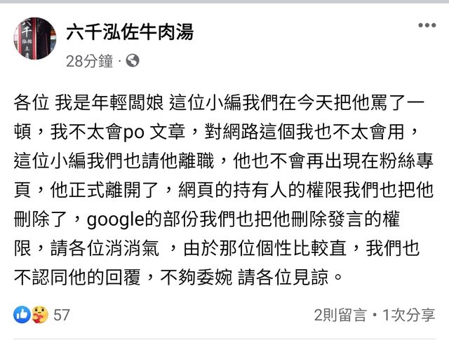 推 ksutme: 想也知道有權限回應的就是老闆,又不是連鎖大店 08/28 23:33