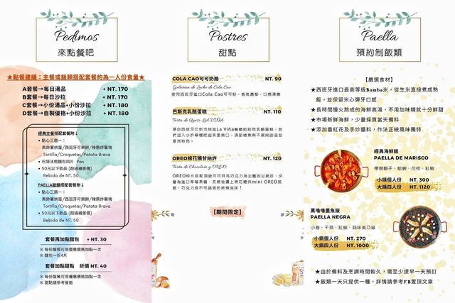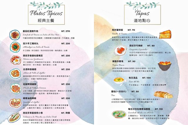 舊菜單,有西班牙經典主菜、道地點心,其中蒜油蝦和小卷,都是站長很喜歡的西班牙菜