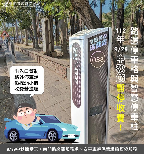 (含智慧停車柱格位)9月29日中秋節當日暫停收費1日。同