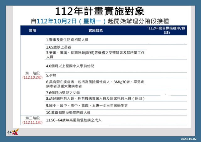 2日起開打,第2階段自11月1日開始(50至64歲無高風險慢