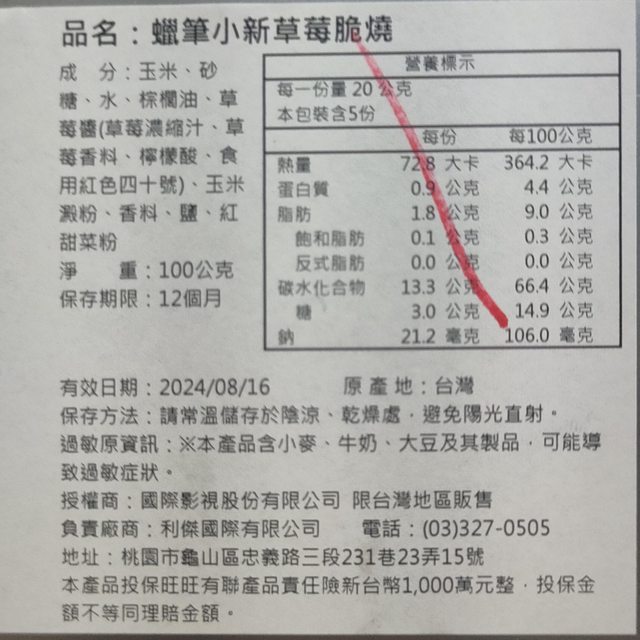16. 蠟筆小新草莓脆燒一桶售60元,有效期限2024/8/16