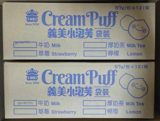 義美小泡芙57克x12包一箱300元,牛奶口味有2箱,巧克力一箱,有效期限2024/7/30