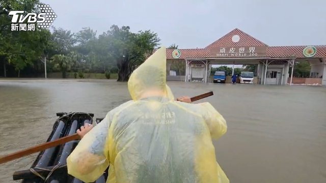 台南頑皮世界遭逢大水,園區聯外道路因積水過深導致無法通行,保育員擔心動物安全,