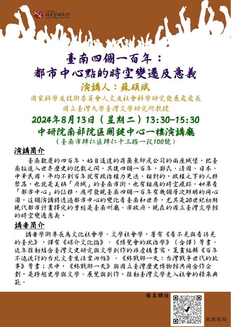 講題:臺南四個一百年:都市中心點的時空變遷及意義