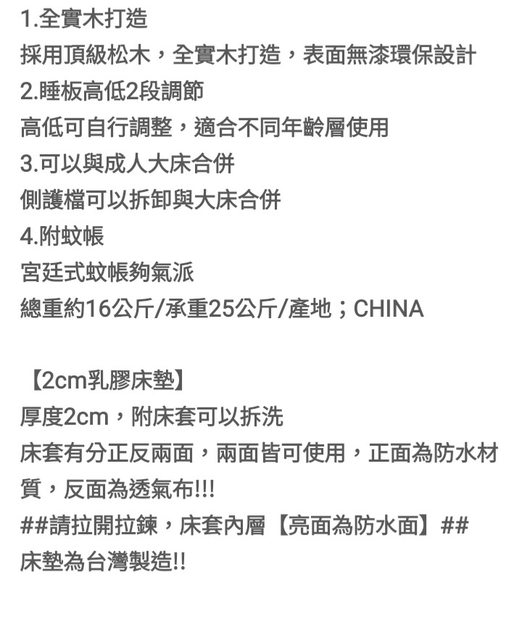 交易物品/金額/說明: 實木嬰兒床$1500,2年前購買 放在南部婆家,僅回台南過年時僅
