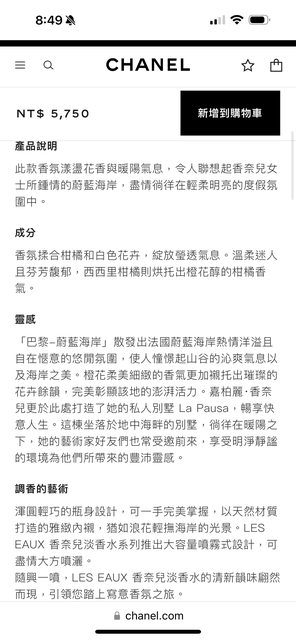 標題[交易] 全新 CHANEL 蔚藍海岸香水 125ml
