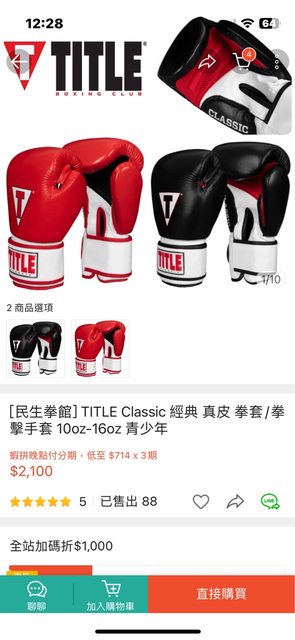 2. Title 經典真皮拳擊手套(12oz /M) 使用過5次,無破損、無髒污、民生拳館購入