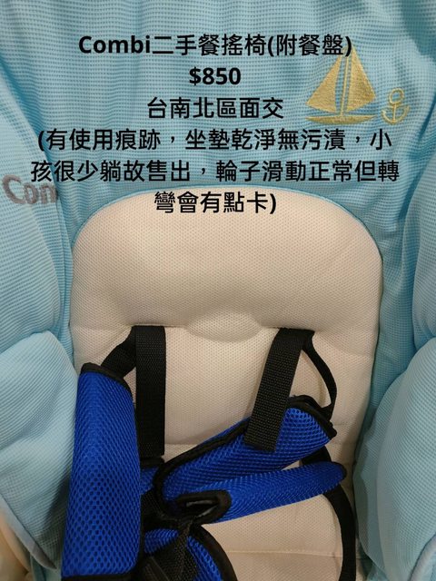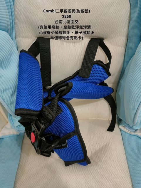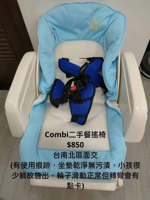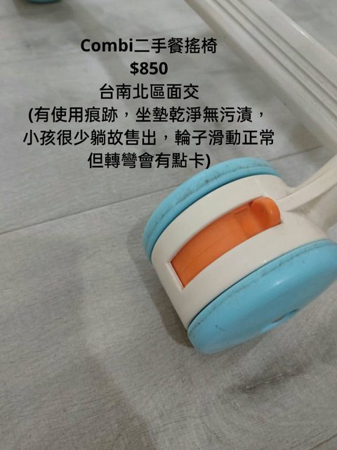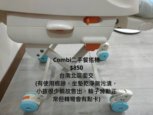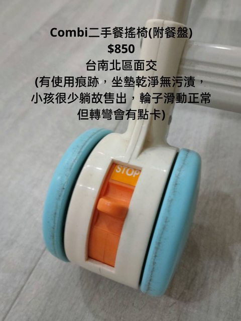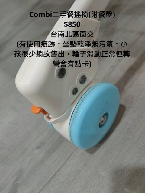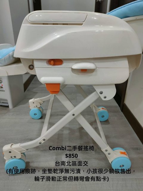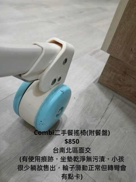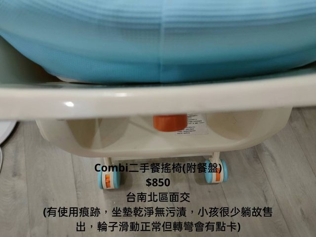 交易類別:出售 面交地點(須為台南市內): 台南北區 交易物品/金額/說明:(避免誤解請盡量於文內詳細說明) Combi二手餐搖椅(附餐盤) $850 (有使用痕跡,坐墊乾淨無污漬,小孩很少躺故售出,輪子滑動正常但轉彎會有點卡)