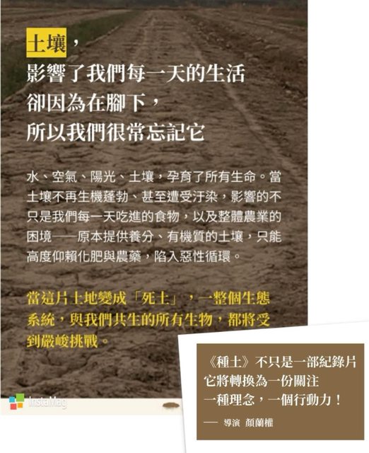 「種土」是無米樂女導演顏蘭權花了8年拍的紀錄片。紀錄了兩代人對於有機種植,為復