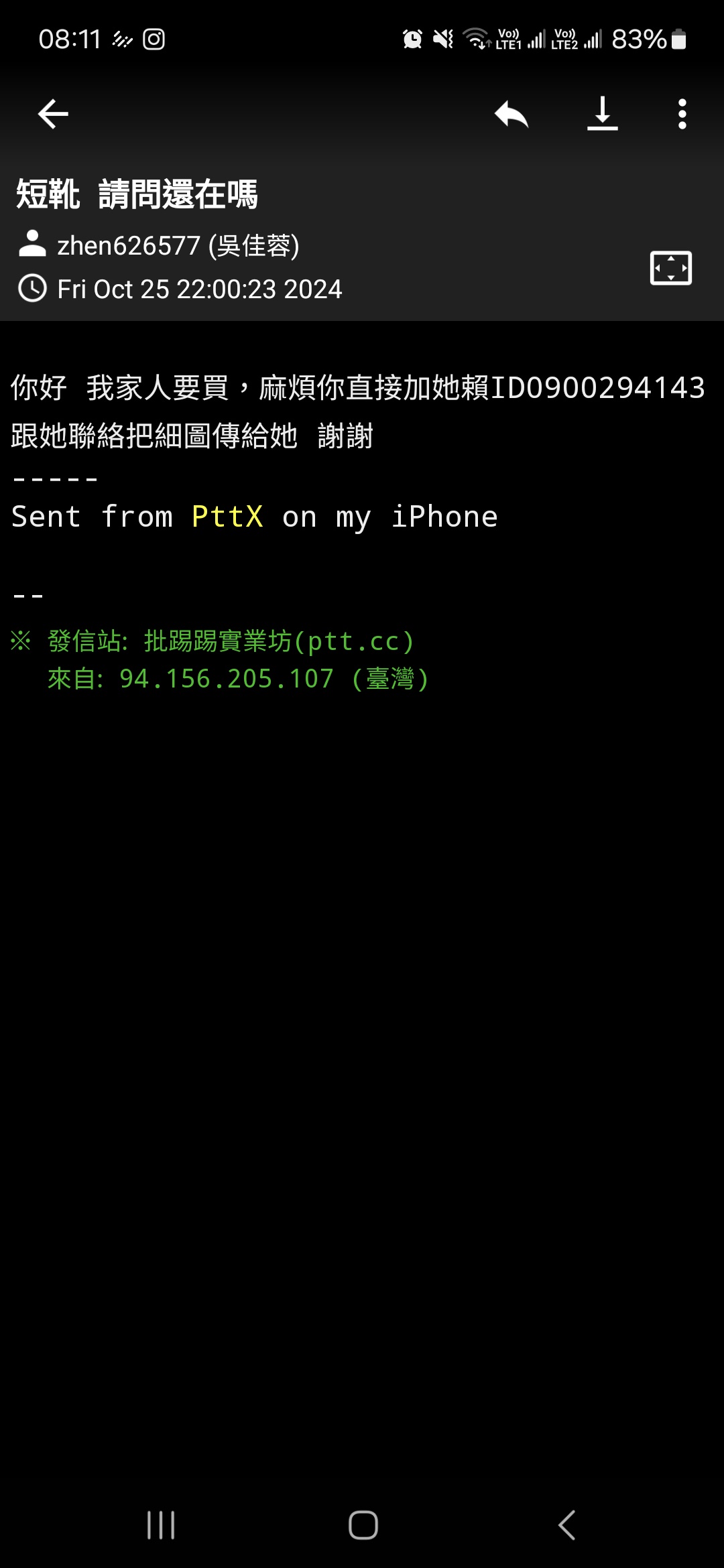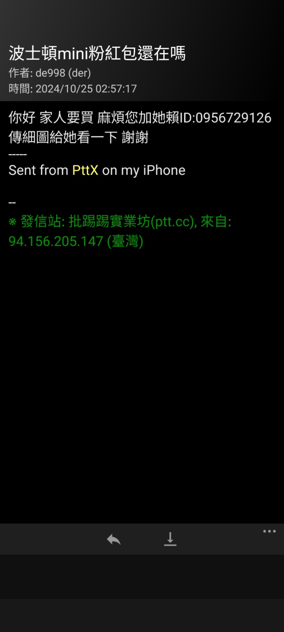 下午發了交易文,後來帳號為「姓氏/名(英文)」+「626577」的版友表達其家人想購買