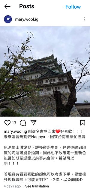 → kate64: 發現對方早已回國,所以4:40才在IG以賣家身份詢問剩下顏色 10/30 07:14