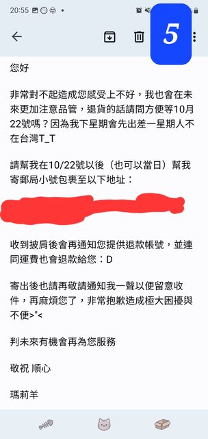 → nochewen: 幾月幾日幾點幾分已先收到賣家退款,退貨商品也已退至郵 10/30 17:09