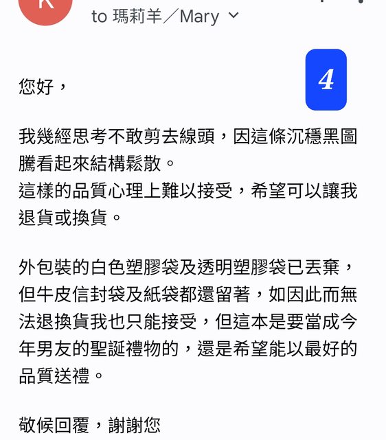 → nochewen: 為你沒保留包裝就拒絕退貨。既然他寫了「收到貨後會退 10/30 04:28