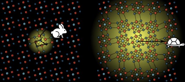▲ 矽材料的電子像兔子亂蹦,Re6Se8Cl2 材料的聲激子-極化子像烏龜穩定前進。(
