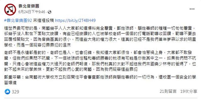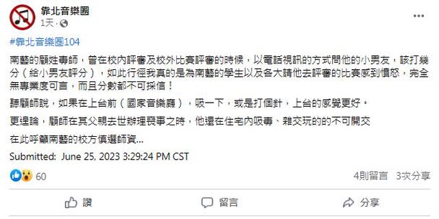 標題: [新聞]南藝大國樂系2教授遭爆餵毒、性騷樣樣來