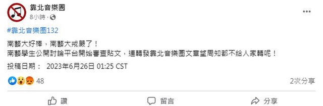 FB 南藝學生公開討論平台開始審查貼文