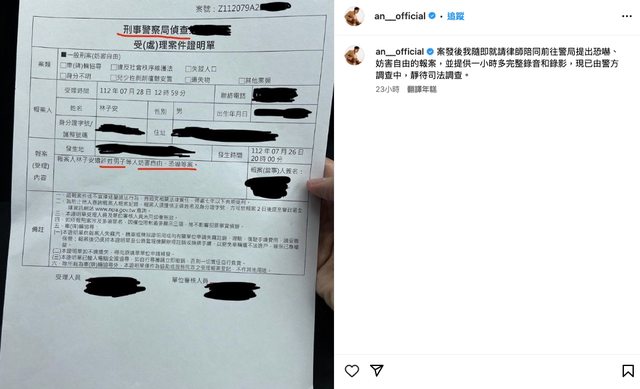 原以為過了一個月事情應該落幕,8月29日林子安又在IG發文,秀出報案證明,「案發後