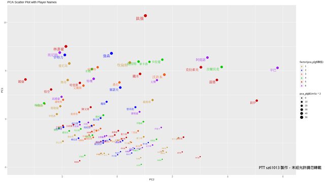 幫助下撰寫R指令,利用ggplot2套件畫出PLG第三季的球員PCA散點圖。