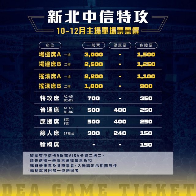 售票場次|10~12月份中信特攻主場例行賽事(共6場)