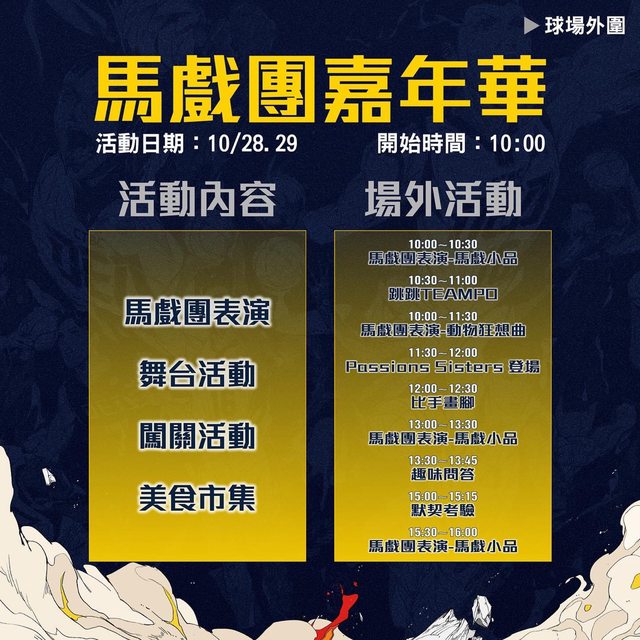 今年開幕週在球場外圍將舉辦馬戲團嘉年華,邀請大家一起來一起慶祝隊史首冠!