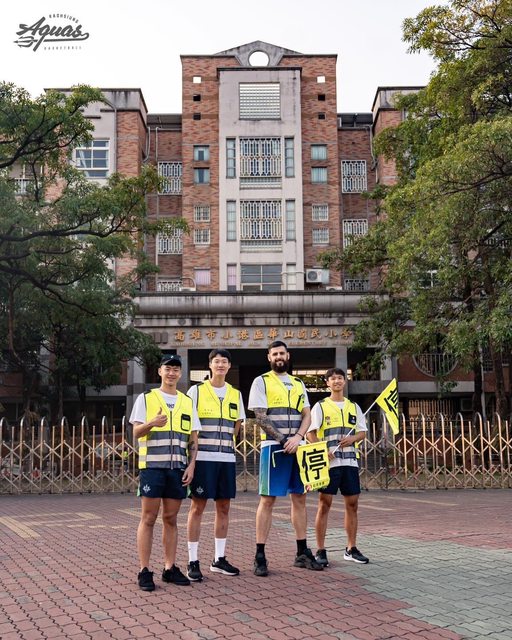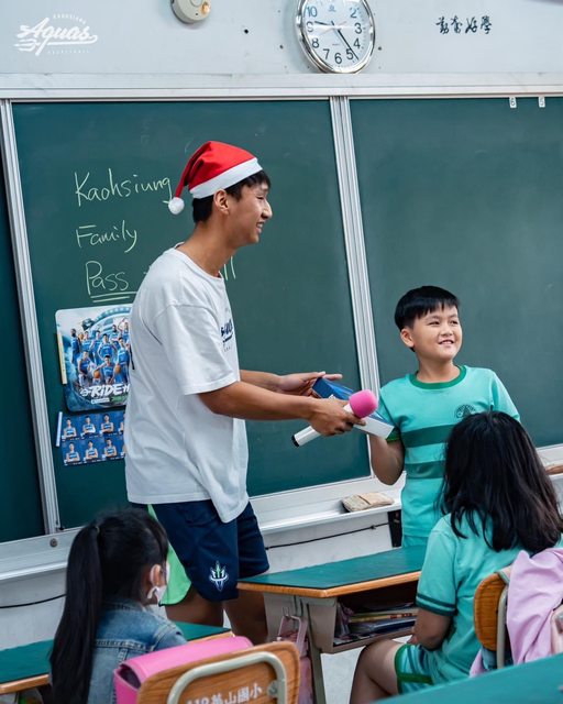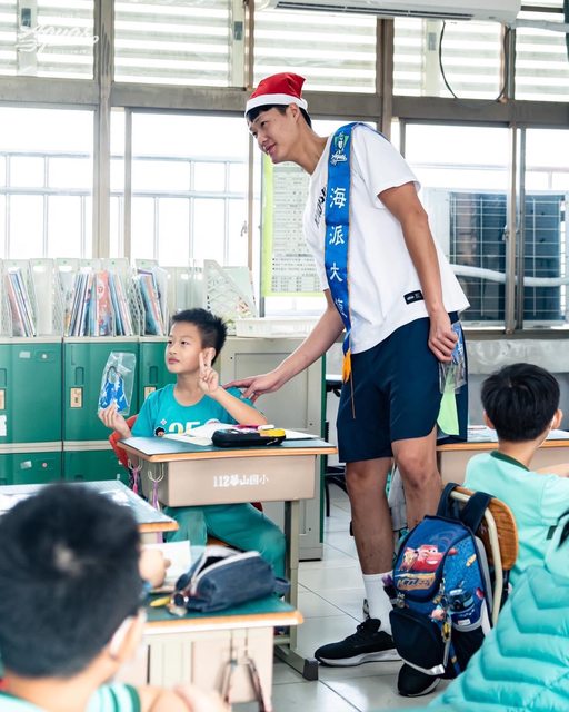 高雄全家海神職業籃球隊 13 日浪愛延續校園活動,由小港區海派大使吳怡斌帶隊,攜手蘇文儒、邱子軒、艾倫走訪小港區華山國小。