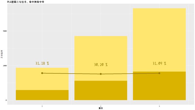 、富邦出走ABL導致賽程縮水所致,這兩個賽季的三分球數量降低或許也是這個原因。有