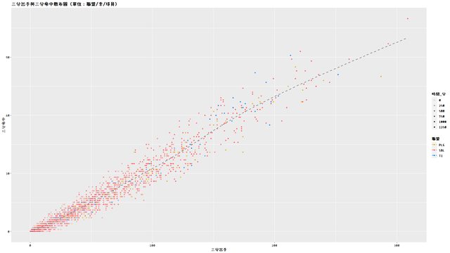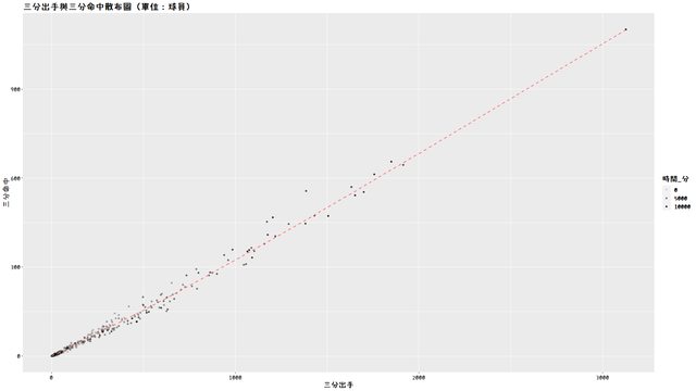 第二張圖則是不區分聯盟和賽季,以球員生涯三分出手與三分命中繪製的散布圖。