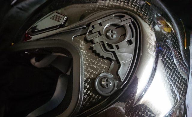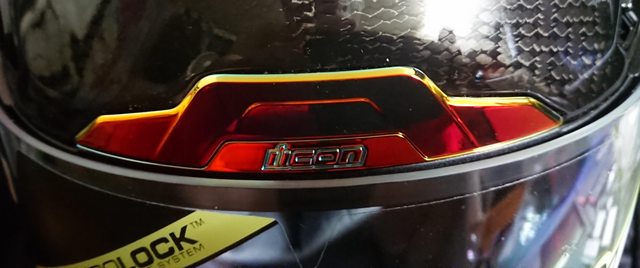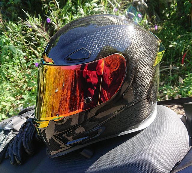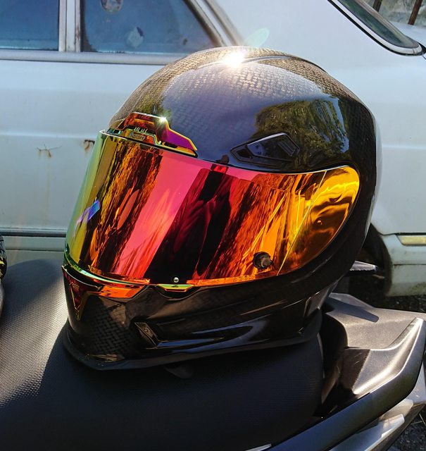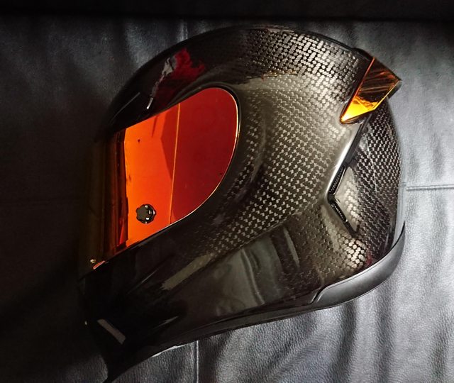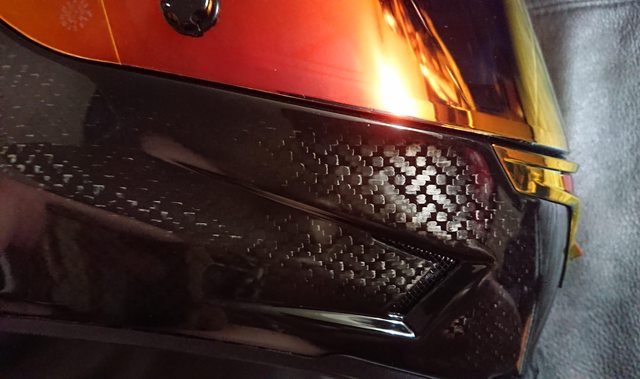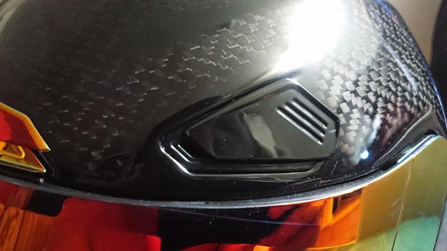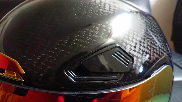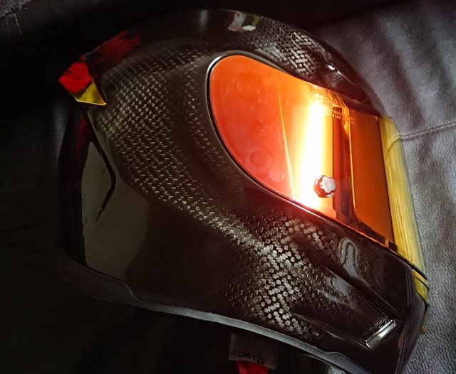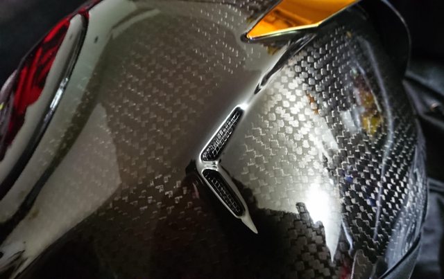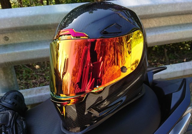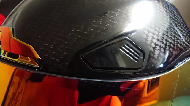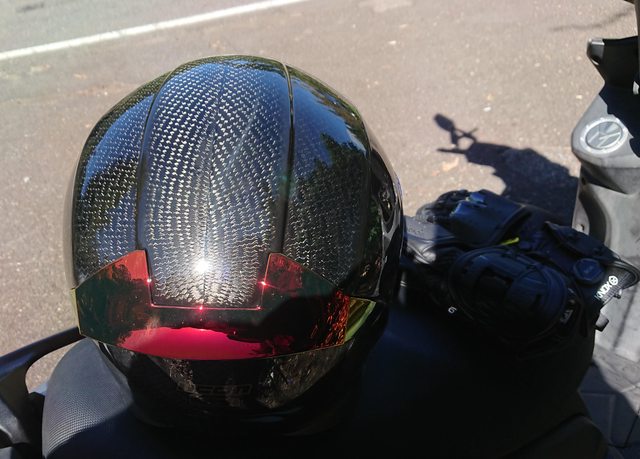 安全帽本體, 因為室內光源實在有夠難拍,直接拿一張外面拍的頂著。 配色整體是亮面碳纖維原色,搭配一些電鍍紅的開關配件來點綴。