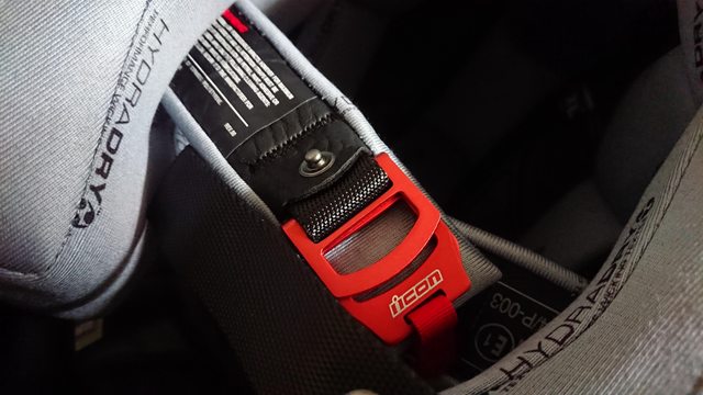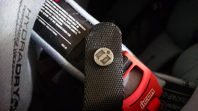 頤帶尾端的收尾是壓扣, 但覺得 Icon 的帽子這部分設計都稍微偏短。 實際上穿戴後要扣好,就不是那麼好扣。