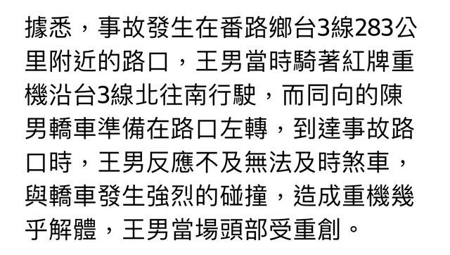 警方初步調查,王男當時騎重機沿省道台3線由北往南行駛,抵達事故路口,同向的陳男