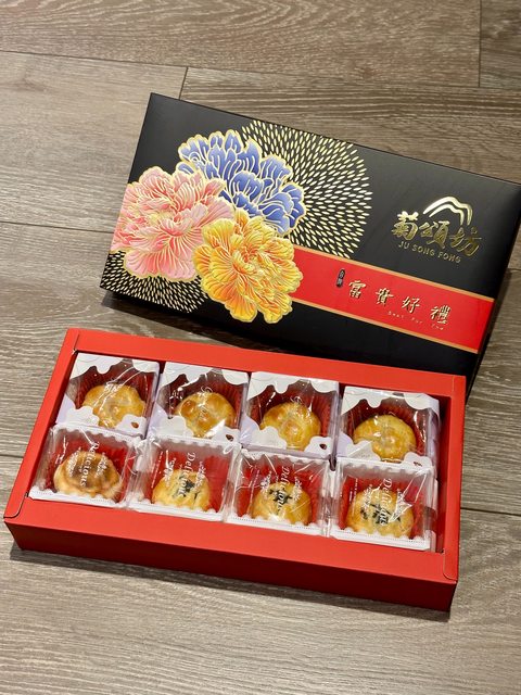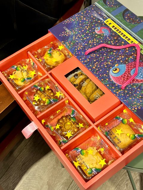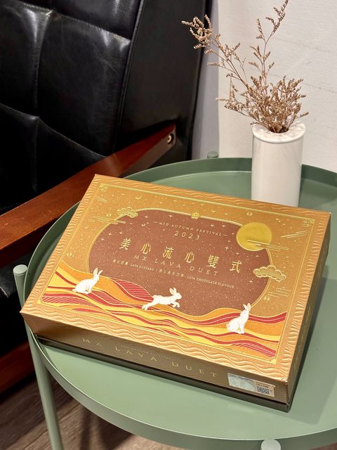 家裡身價最高的中秋禮盒,今年的包裝設計我覺得蠻美的,這款有流心奶黃和流心巧克力