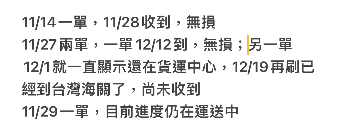 推 lavenderann: 11/24訂11/25出貨12/08到,三單都是123.193.183.3 12/19 20:33