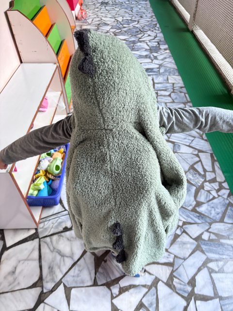 恐龍袋子他用來裝便當盒(對便當盒來說有點大)