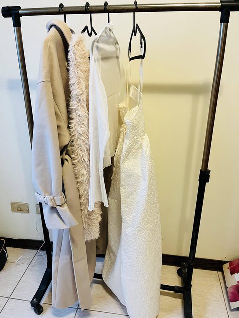 總共四個單品:小包包、背心裙、白色洋裝和高領上衣