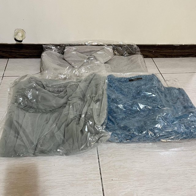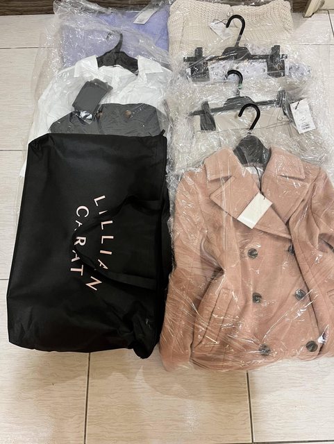 六件:一件外套、一件褲子、一件魚尾裙、一件魚尾洋裝、一件紫色袖套毛衣、一件白色短外