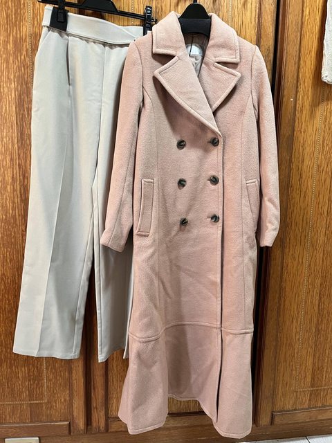 鮭魚粉(偏橘)長版大衣,很重!不確定我153會不會拖地