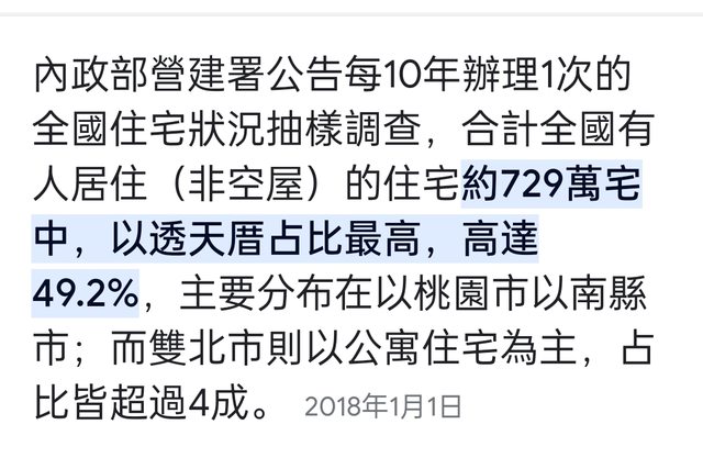 : 看起來全國有房的人只有555萬人左右 你貼的這個數據,要看清楚定義是:單一所有權人住宅 如果是夫妻共有,各 1/2 產權 (或是其它比例),那就不會被列在你上面的統計裡。 要看全國名下有房的統計,我之前有分享過 https://www.ctwant.com/article/100370 全國性房屋稅籍所有權人總歸戶,2020年擁有房子的人有 804.17萬人。 其中擁有 1戶者大約有572.47萬人 (71.19%)、 2戶的個人有153.46萬人 (19.08%) 擁有兩戶以內的人數佔比:90.27% 原始資料:https://i.imgur.com/6v5t0gq.jpg