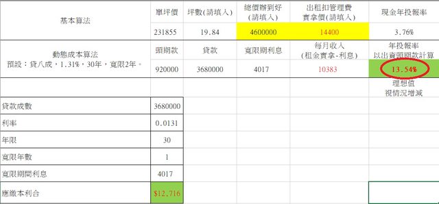 年初認識了一位大投客貴人,學到了現金投報率的算法,自己拉Excel算覺得可以置產,