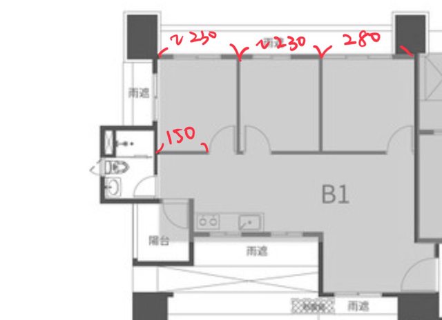 最近看到一間新成屋,格局如下,只有一部分尺寸可參考