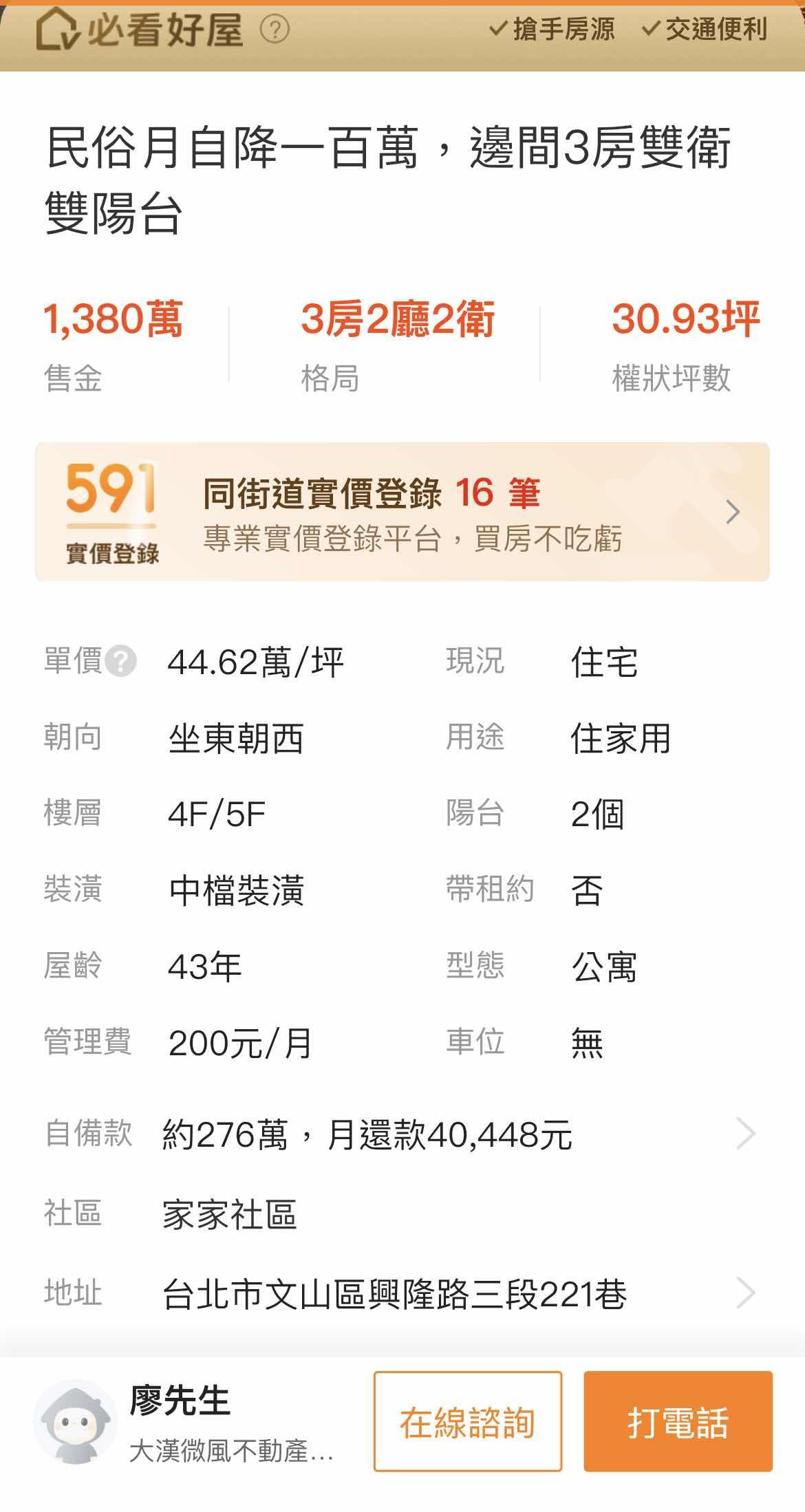 < 本人同意並願意遵守現行法律、本站使用者條款、本站各級規定、本板所有規範, 本人願意為本文內容負責,並保証本文內容皆詳盡屬實,若違反相關規範,願受處分。 本文僅授權發表於PTT實業坊,未經同意不得轉載至其它網站,否則得視情況提出告訴。 房屋地點:台北市 文山區 房屋屋齡:40年 房屋類型:公寓 房屋坪數:25-30坪 房屋格局:3房2 廳 1-2衛 1-2陽台 是否加蓋:否 買價 : 1300萬元 不含車位 聯絡方式:站內信 -- ※ 發信站: 批踢踢實業坊(ptt-website.tw), 來自: 114.32.78.8 (臺灣) ※ 文章網址: https://ptt-website.tw/home-sale/M.1693641041.A.E00