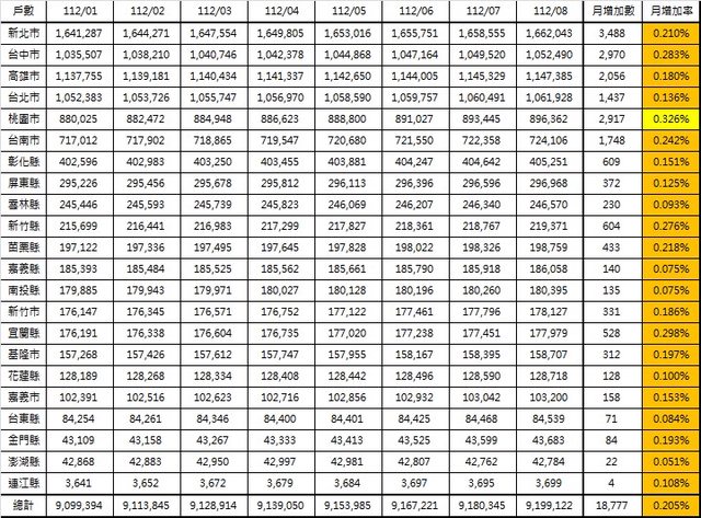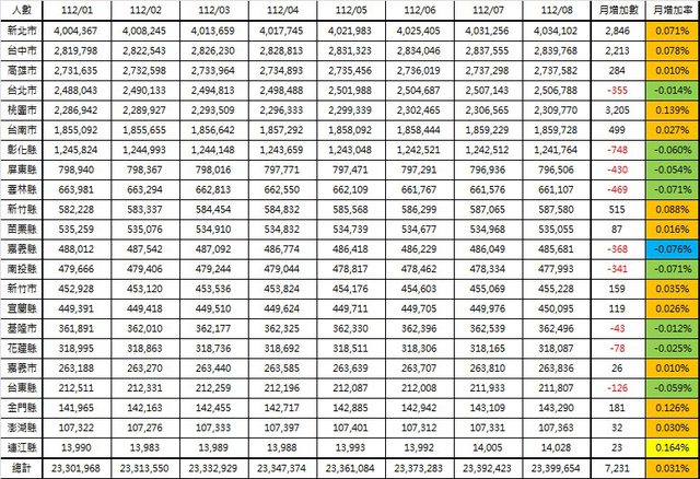: 2023年08月全國人口出爐