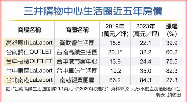 三井LaLaport或OUTLET等購物商場陸續開出,驅動周邊房價水漲船高,近五年都有近3成
