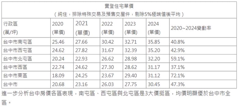 觀察實價登錄數據,台中市連續5年房價穩定成長,從2020年均價每坪20.68萬元,漲至