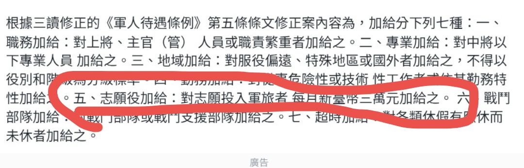 推 fs6u12: 新聞標題稍微誤導,志願役加給今年從1萬變成1萬5,三讀過 06/10 13:52