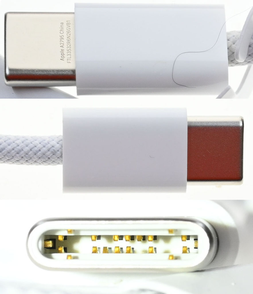 接器採用一體成形金屬外殼,其中一端接頭的其中一面有Apple A2795 China字樣及編號