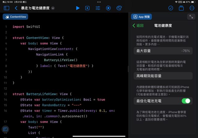 去年九月 Swift Playground 用一個蘋果發布會的時間就能拉一個電池健康度的介面。